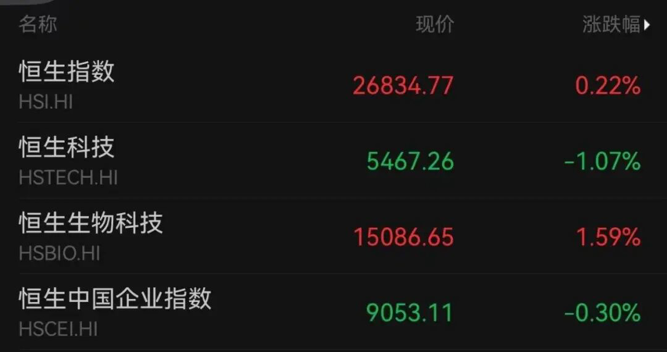 2月3日,港股大市转稳。截至收盘,三大指数表现不一,恒生指数上涨0.22%,报收26834.77点;恒生科技指数下跌1.07%,报收5467.26点;恒生国企指数跌0.30%,报收9053.11点。