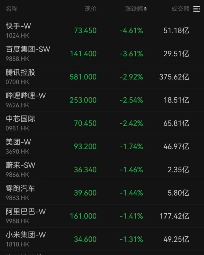 快手跌超4%,百度跌超3%,腾讯控股、哔哩哔哩等跌超2%。其中,腾讯控股今日成交额达到375亿港元,阿里巴巴今日成交额达到177亿港元。
