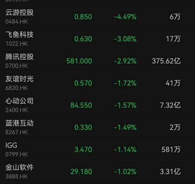 受此消息影响,港股科网股今日跌势靠前,恒生科技指数盘中一度跌近4%,截至收盘,跌幅收窄。手机游戏板块同样承压。