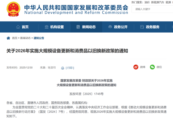 12月30日,国家发展改革委官网发布《关于2026年实施大规模设备更新和消费品以旧换新政策的通知》(以下简称《通知》),对明年的“两新”政策作出说明。