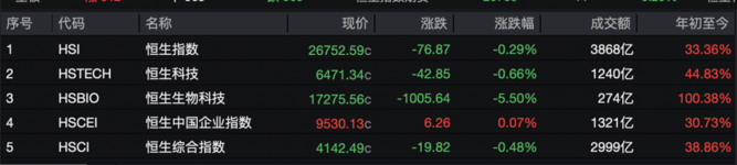 10月9日,港股三大指数涨跌不一。恒生指数收跌0.29%,恒生科技指数收跌0.66%,恒生国企指数涨0.07%。 全日大市成交额为3868亿港元,南向资金净流入30.43亿港元。