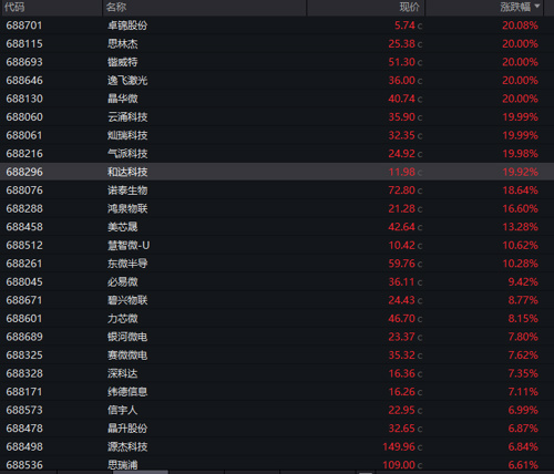 受“科创板八条”政策利好影响,半导体板块逆市走强,科创50指数收涨0.51%。8家公司“20CM”涨停,14家公司涨逾10%。
