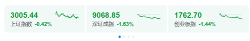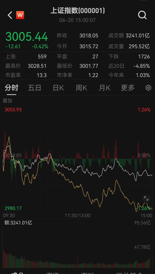 6月20日,沪指震荡调整,午后逼近3000点关口,深成指、创业板指均跌超1%。截至收盘,沪指跌0.42%,深成指跌1.63%,创业板指跌1.44%。
