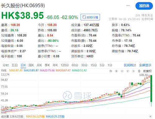 长久股份一度闪崩暴跌超70%。在此之前,公司股价一路上涨,从年初最低的6.05港元附近涨至今天盘中最高的108.2港元,期间自低位的最大涨幅接近17倍。