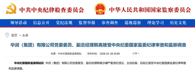 2月28日,中央纪委国家监委官网通报:华润(集团)有限公司党委委员、副总经理韩嵩涉嫌严重违纪违法,主动投案,目前正接受中央纪委国家监委纪律审查和监察调查。