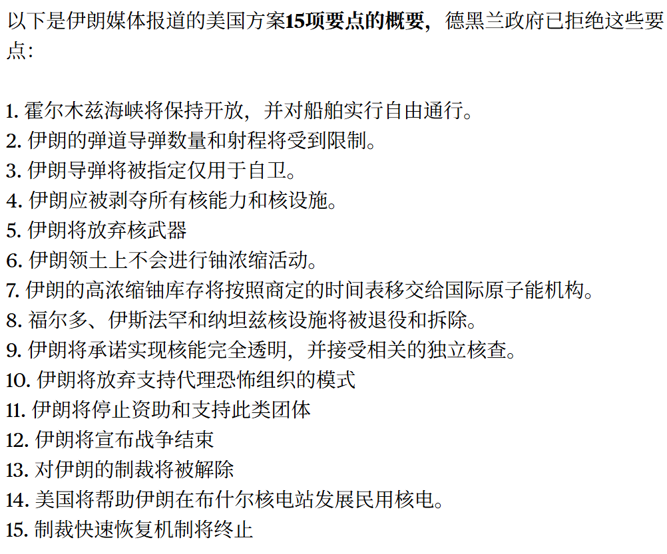 多位知情人士称,该方案要求伊朗拆除其主要核设施,并将导弹能力限制为仅用于自卫。作为交换,伊朗将获得部分让步,包括制裁缓解。