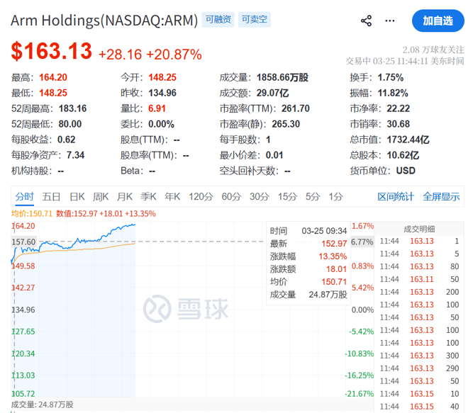 今晚美股最受瞩目的个股,应该是芯片设计公司ARM,其股价暴涨超过20%。