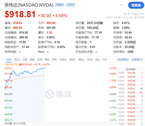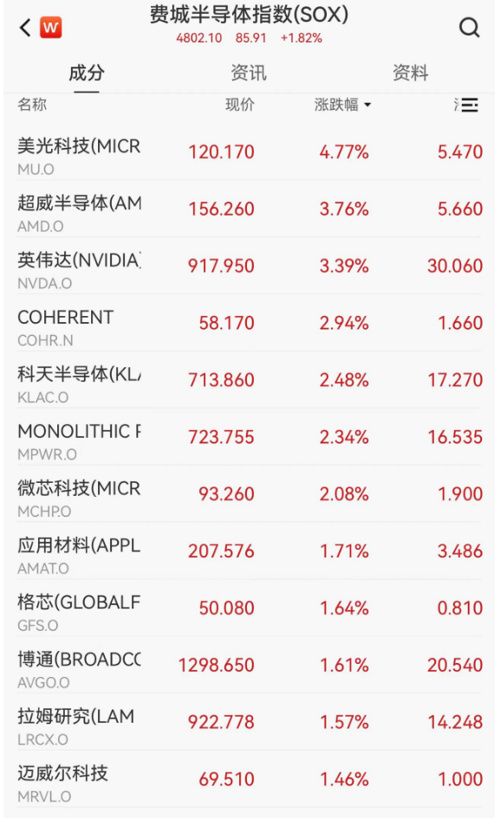 半导体板块走强,英伟达涨超3%,股价重回900美元关口。美光科技涨超5%,此前,Baird将美光公司股票评级从中性上调为跑赢大盘,并认为美光公司股票“未来有重大机遇”。