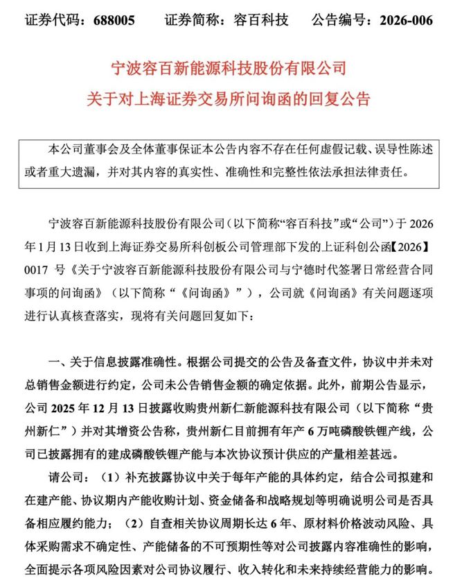 1月14日,容百科技发布关于延期回复上交所《问询函》的公告。