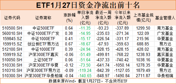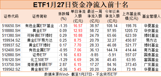 有色、黄金板块强势上攻,相关ETF也成为近期ETF市场最为“吸金”的品种。Wind数据显示,1月27日,华夏有色金属ETF基金单日资金净流入16.57亿元,位居全市场非货ETF榜首。华安黄金ETF、可转债ETF博时资金净流入也均超10亿元,分别为12.93亿元、10.88亿元。单日资金净流入超过5亿元的黄金ETF易方达、黄金ETF博时、南方有色金属ETF、华夏黄金股ETF等产品也大多数是有色、黄金等品种。展望黄金后市,国泰基金认为,近期黄金价格的上涨不仅源于其避险属性,也受益于“抛售美国”交易逻辑的再现,市场对美国资产信心产生动摇、降息周期与地缘局势紧张形成黄金价格上行的合力。目前黄金波动率有所提高,但市场结构或仍相对健康。美联储降息周期、海外不确定性加剧、全球去美元化趋势、央行和Tether等发行商购金等,黄金的长逻辑仍然稳固,注意短期价格高位波动或回调的风险。谈及有色板块,国泰基金指出,铜方面,美国库存短期虹吸或有所减弱,但供给扰动持续,供需紧张格局不改;锂方面,去库持续,供给侧扰动频发,部分矿停产确定性较高,2026年或由紧平衡转为去库,支撑锂价上行。镍、锡等小金属在宽松宏观环境、供给端扰动、有色板块情绪支撑下也有望保持强势。未来看好逆全球化与新需求共振下的有色板块投资价值。中银基金也表示,市场对主权货币信用的担忧使得实物资产的需求量大增,贵金属的做多逻辑得到进一步强化,价格同步上涨。展望后市,格陵兰岛事件、美联储新任主席人选、美伊会谈进展、特朗普全球关税案的审判结果等,都或将显著影响市场短期交易预期。资金净流出方面,ETF资金净流出榜前十名“清一色”被宽基ETF包揽,其中,三只沪深300ETF位居全市场资金净流出榜前三,合计资金净流出超330亿元。编辑:赵新亮