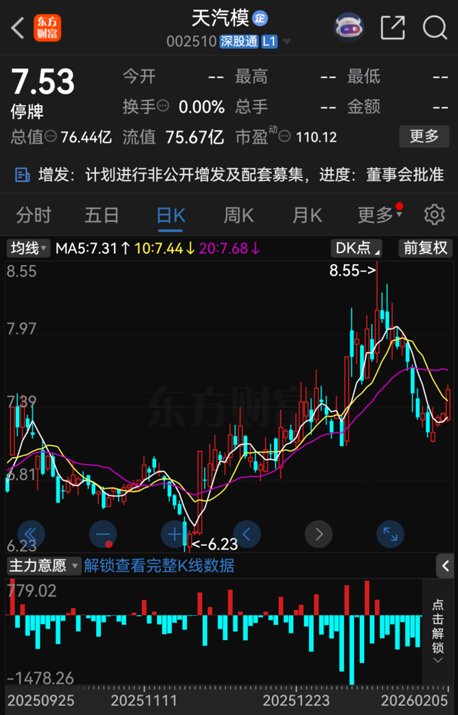 天汽模针对上述交易自2月6日开市起停牌,计划自2月12日开市起复牌。2月5日收盘,天汽模股价报7.53元/股,涨幅达2.59%,总市值为76.44亿元。