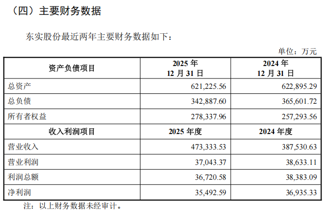 2024年、2025年,东实股份的营业收入分别为38.75亿元、47.33亿元;净利润分别为3.69亿元、3.55亿元。