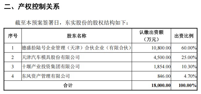 股权穿透可见,东实股份的股东为德盛16号、天汽模、十堰产业投资集团有限公司、东风资产管理有限公司,持股比例分别为60%、25%、10.30%、4.70%。