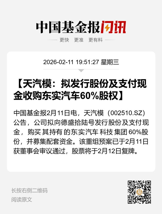 2月11日晚间,天汽模发布交易预案称,公司拟通过发行股份及支付现金的方式购买东实汽车科技集团股份有限公司(以下简称东实股份)60%的股份,并募集配套资金,预计构成重大资产重组。