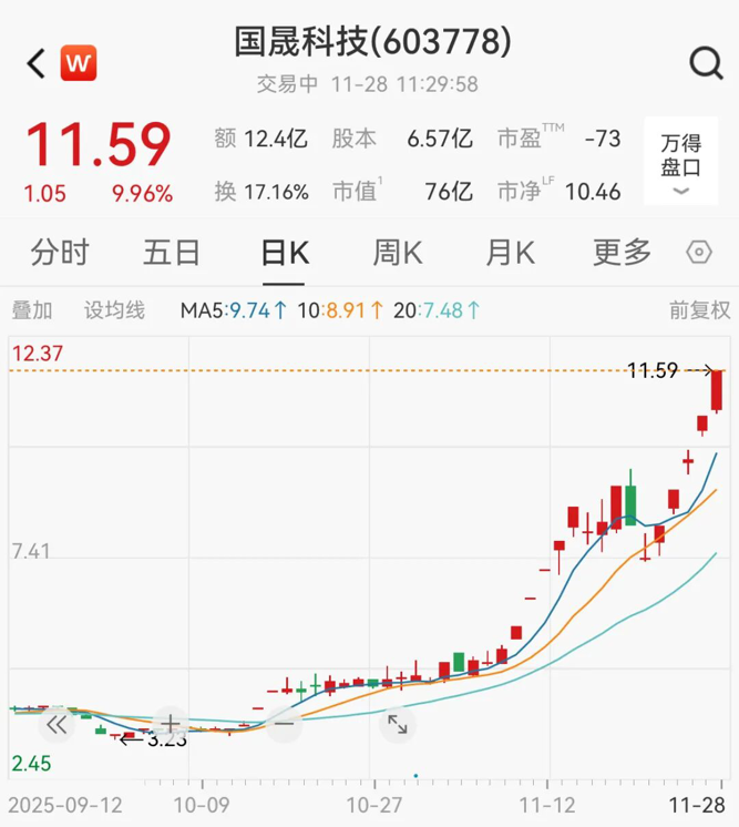 截至午盘,该股报11.59元/股,最新市值攀升至76亿元。