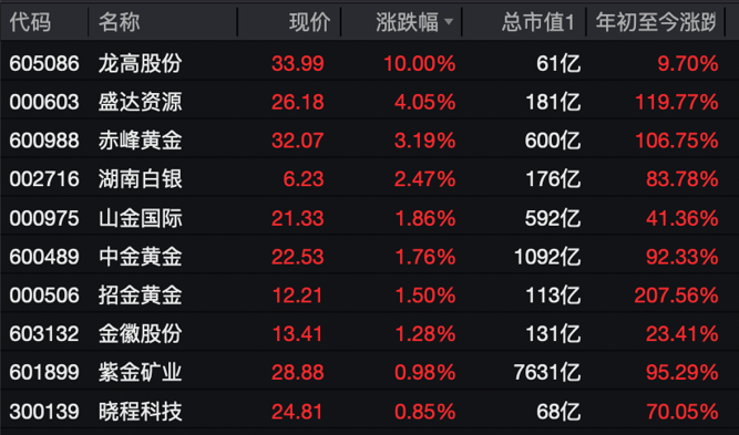 A股热门股方面,龙高股份10cm涨停,盛达资源涨超4%,赤峰黄金、湖南白银、山金国际、中金黄金、招金黄金、金徽股份等跟涨。