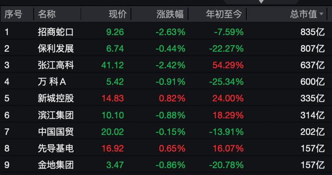 个股方面,招商蛇口、张江高科、大悦城、城投控股等下跌。