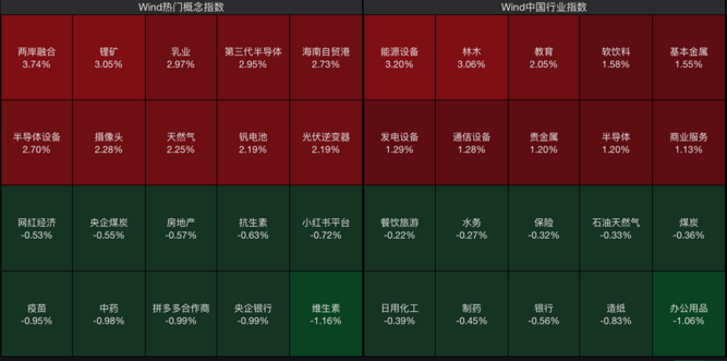 从板块看,能源金属板块领涨,锂矿、半导体设备概念板块走强,两岸融合、海南自贸区概念板块再度活跃,乳业板块出现异动拉涨,贵金属板块反弹;银行保险、制药、煤炭等少数板块走弱。