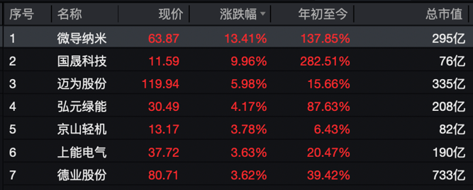 另外,其余光伏设备相关个股方面,上午微导纳米大涨13.41%,迈为股份、弘元绿能、京山轻机、上能电气等跟涨。