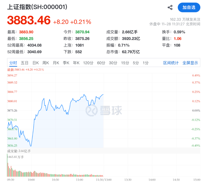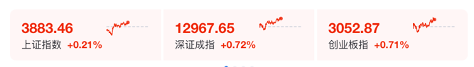 截至午间收盘,沪指报3883.46点,涨0.21%;深证成指涨0.72%;创业板指涨0.71%。