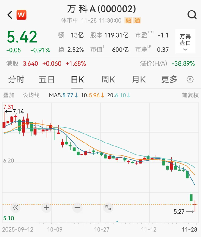 万科A股价一度跌超3%,日内最低报5.27元/股,续创2015年8月以来新低。截至午间收盘,万科A报5.42元/股,日内跌0.91%。