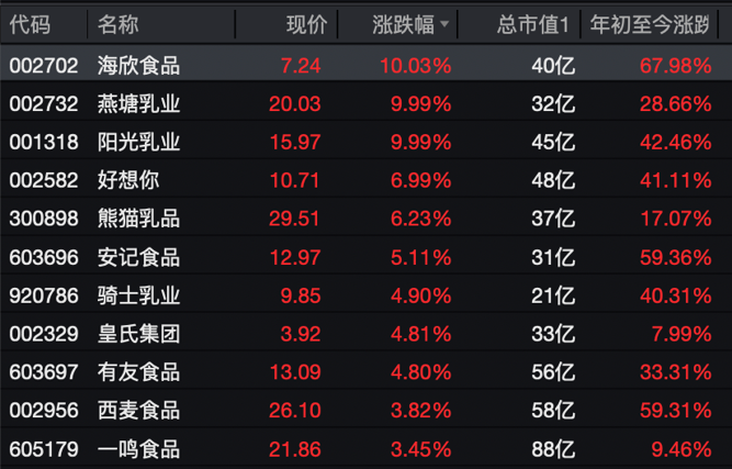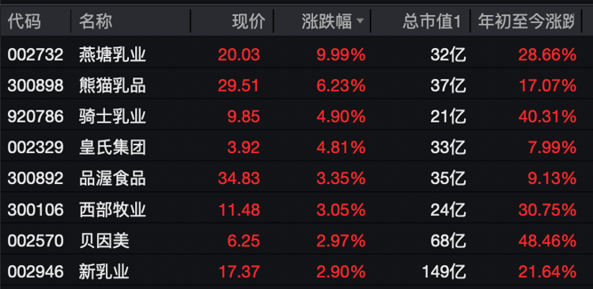 个股方面,燕塘乳业、阳光乳业拉升封板,熊猫乳品涨超6%,骑士乳业、皇氏集团、品渥食品、西部牧业涨超3%,贝因美、新乳业等涨幅明显。