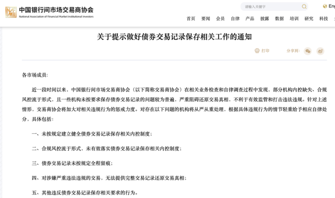 通知显示,近一段时间以来,交易商协会在相关业务检查和自律调查过程中发现,部分机构内控缺失、合规风控流于形式,且一些机构未按要求保存债券交易记录的问题较为普遍,严重阻碍还原交易真相,不利于有效监管和打击违法违规。