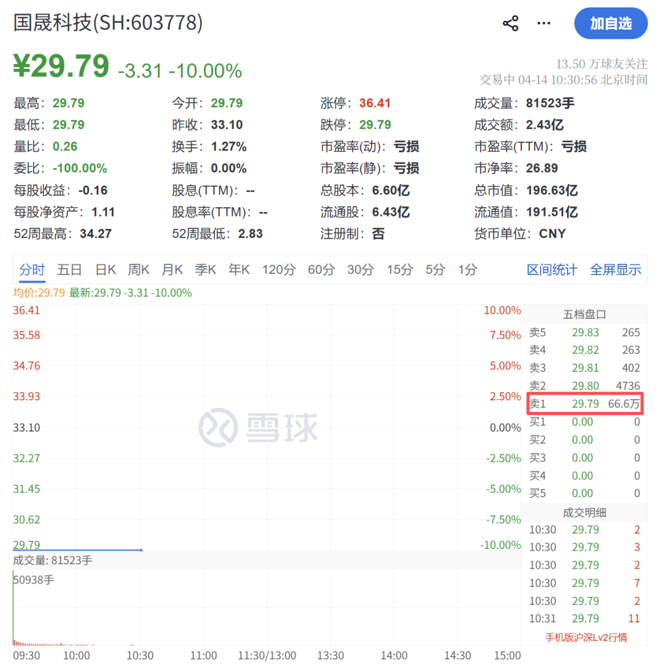 4月14日,近期大牛股国晟科技开盘跌停,报29.79元/股,跌幅为10%,总市值跌至197亿元。截至发稿,卖一超66万手。