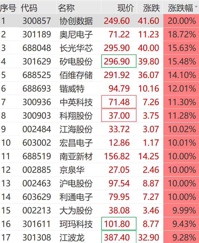 个股方面,协创数据实现20cm涨停,宏昌电子、江海股份、京泉华、利通电子等多股集体涨停,奥尼电子、长光华芯等涨超10%。