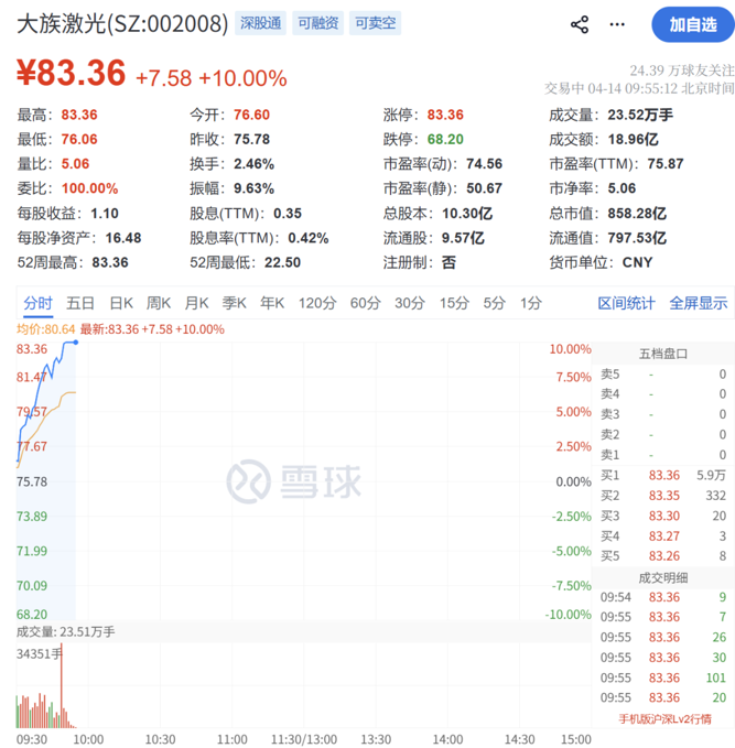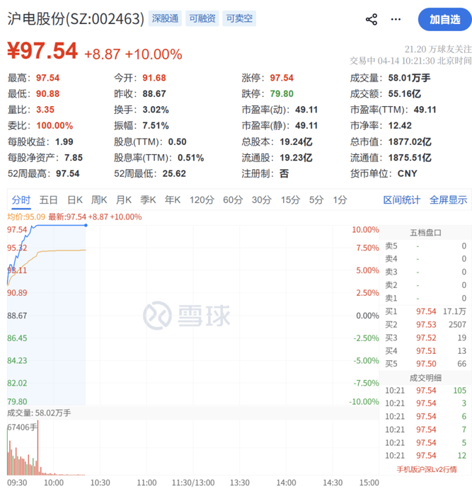 电路板指数强势拉升,沪电股份封住涨停,报97.54元/股,股价再创历史新高。大族激光同步涨停,报83.36元/股。