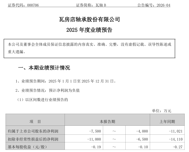 瓦轴B预计2025年归母净利润亏损4000万元至7500万元,扣非后净利润亏损6500万元至1.1亿元。