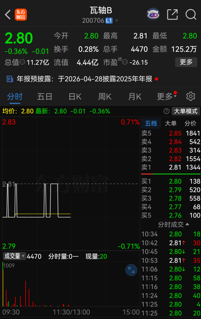 2月24日上午收盘,瓦轴B股价报2.80港元/股,总市值为11.27亿港元。