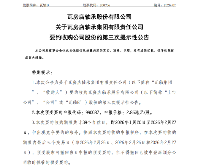 2月24日,瓦轴B发布《关于瓦房店轴承集团有限责任公司要约收购公司股份的第三次提示性公告》。