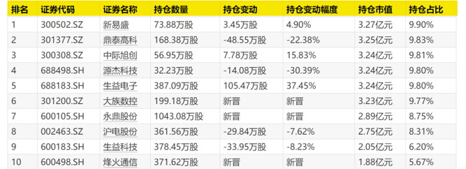 与上季度相比,生益电子、中际旭创、新易盛获不同程度加仓,加仓幅度分别为37.45%、15.83%、4.90%,持仓市值同样均超3亿元。