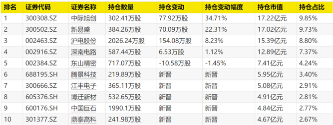 与上季度相比,沪电股份、中际旭创、新易盛、深南电路获加仓,加仓幅度分别为8.23%、34.71%、22.31%、1.12%;东山精密遭减仓10.58万股,减仓幅度为1.45%。