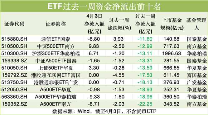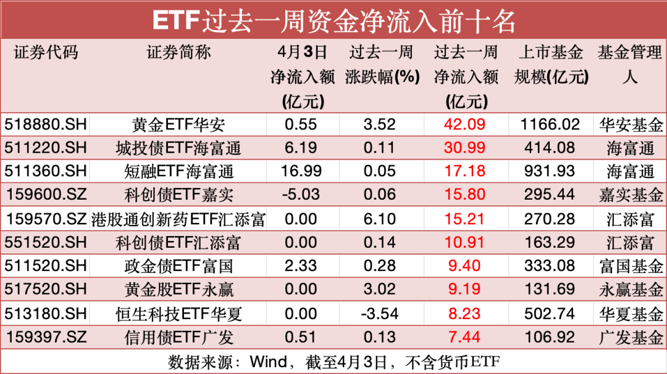 此前受美伊冲突影响下跌较多的多只ETF,在过去一周获场内资金逆市增持。Wind数据显示,截至4月3日,黄金ETF华安“吸金”超42亿元,位居全市场非货ETF榜首。此外,跟踪黄金股板块的黄金股ETF永赢过去一周也获得超9亿元的资金净流入,跻身全市场非货ETF前十名。谈及黄金近期的大幅回调,华安基金认为是典型的流动性冲击与恐慌情绪引发的“踩踏式”抛售,而非对黄金基本面的否定。展望后市,流动性冲击与恐慌性抛售往往是短期冲击,当前市场对降息的预期已接近“清零”,对美联储鹰派的预期已演绎得较为极致,而未来任何美国经济增长放缓的信号都可能引发这一预期的修正。华安基金指出,从中长期看,支撑黄金的宏观因素并未逆转,包括去美元化下全球央行持续的购金需求、美国“财政主导”政策对美元长期信用的侵蚀压力,以及全球地缘政治格局碎片化带来的系统性风险,黄金对冲“国际秩序崩塌风险”与“主权信用货币风险”的价值持续显现。股票ETF方面,港股通创新药ETF汇添富、恒生科技ETF华夏过去一周分别“吸金”15.21亿元、8.23亿元,进入非货ETF资金净流入前十名,这两个ETF同样也是前段时间回调幅度较多的品种。从资金净流出方向上看,包括A500ETF南方、A500ETF华泰柏瑞、A500ETF华夏在内的三只中证A500ETF位居过去一周资金净流出榜前三,中证A500ETF国泰也进入资金净流出榜前十名,上述4只中证A500ETF过去一周合计净流出超70亿元。《中国基金报》对本平台所刊载的原创内容享有著作权,未经授权禁止转载,否则将追究法律责任。