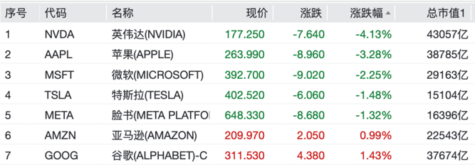 个股方面,英伟达跌超4%,苹果跌3.28%,微软跌2.25%,特斯拉、脸书跌超1%,谷歌、亚马逊收涨。