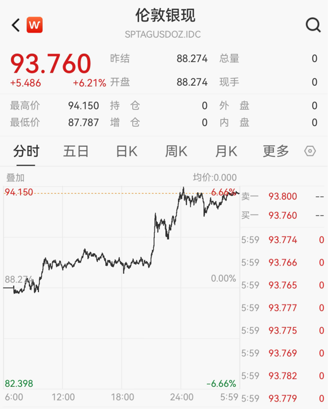 现货白银一度突破94美元/盎司,日内暴涨6.21%。