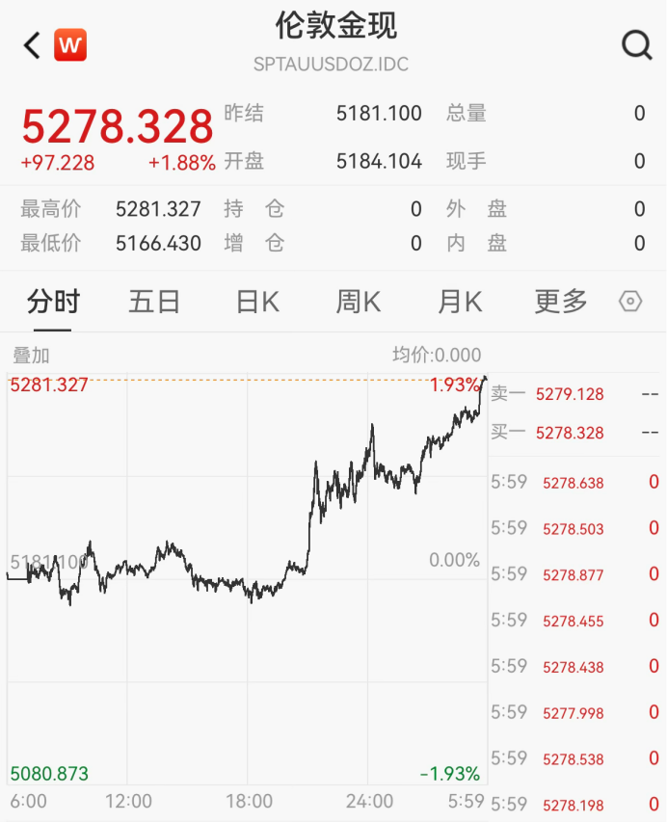 2月27日,现货黄金最高报5281.327美元/盎司,创1月30日以来新高。截至收盘,现货黄金涨1.88%,报收于5278.328美元/盎司。