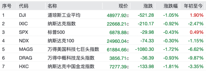 美东时间2月27日收盘,美股三大指数集体收跌,大型科技股多数下跌,银行股、中概股普跌。