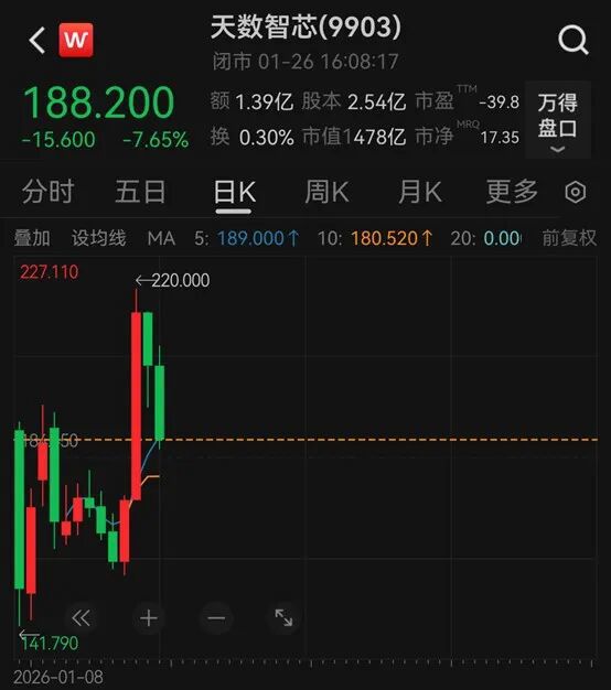 2026年1月8日,天数智芯在港股上市。1月26日,天数智芯股价以188.2港元/股收盘,大跌7.65%,最新市值为478亿港元。