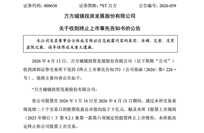 *ST万方股票在2026年3月16日至4月13日期间,连续20个交易日的股票收盘总市值均低于5亿元,触及股票终止上市情形,深交所拟决定终止公司股票上市交易。