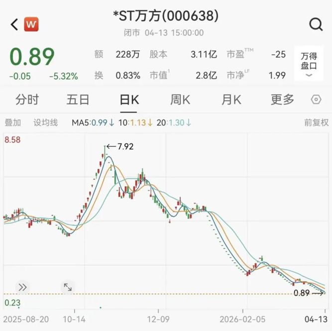 截至4月13日收盘,*ST万方股价报0.89元/股,总市值仅为2.8亿元。