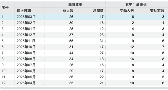 2026年以来截至3月25日,公募机构高管变更81人。截至3月25日,2026年3月就已有3家公募基金董事长变更。其中,崔伟离任东方基金董事长,刘鸿鹏代任董事长;天治基金董事长柴晓秀离任,林洪钧代任;长信基金董事长刘元瑞离任,肖剑被任命为董事长。