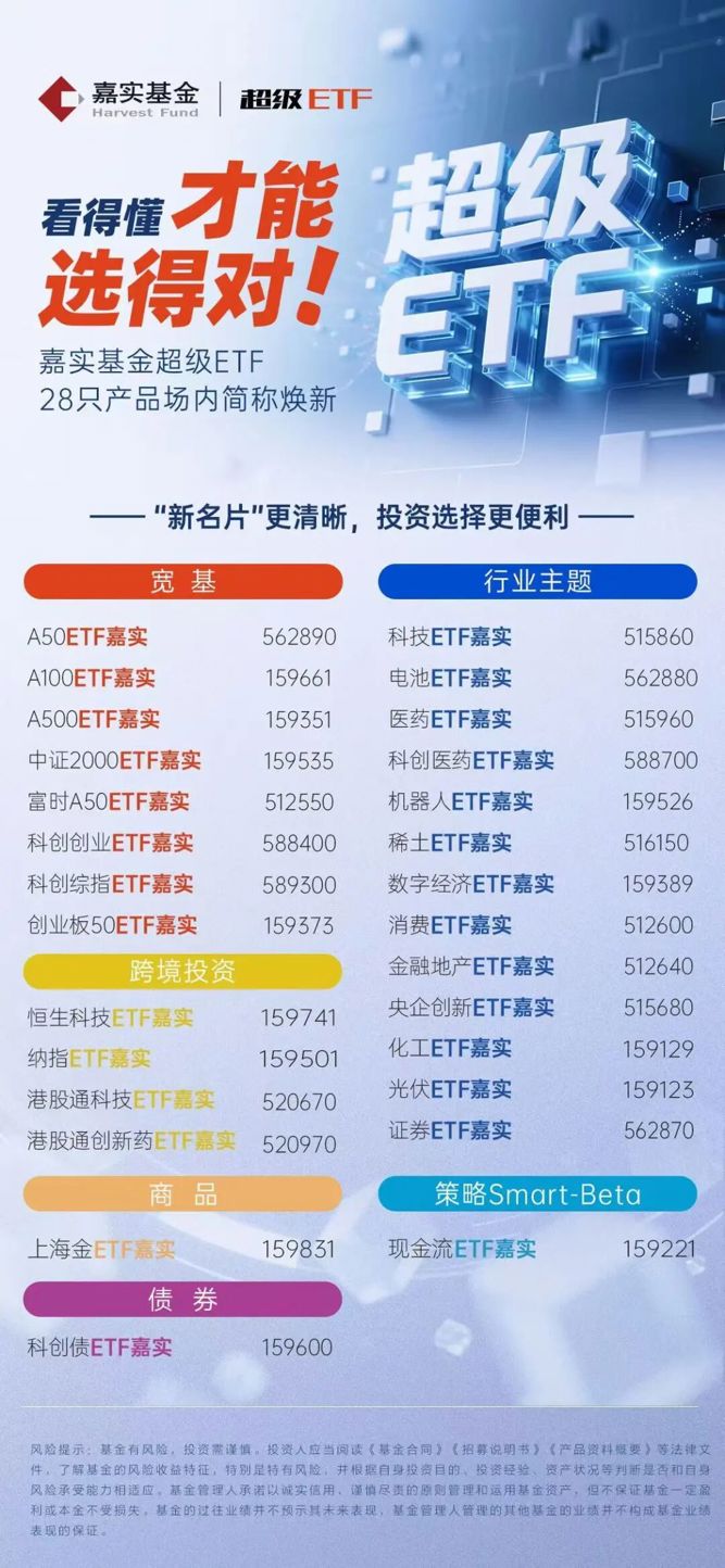 更名潮涌动,所见即所得:2025年年初至今,包括嘉实在内的相关ETF按照“投资标的核心要素+ETF+管理人名称”结构更改扩位简称,这一改革有助于投资者精准区分产品、降低信息筛选和交易误判的风险,也将激励全行业更加注重长期业绩、流动性管理、客户服务。