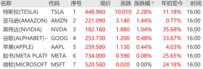 特斯拉涨2.28%,亚马逊涨1.44%,英伟达涨1.04%,领涨美国科技七巨头。