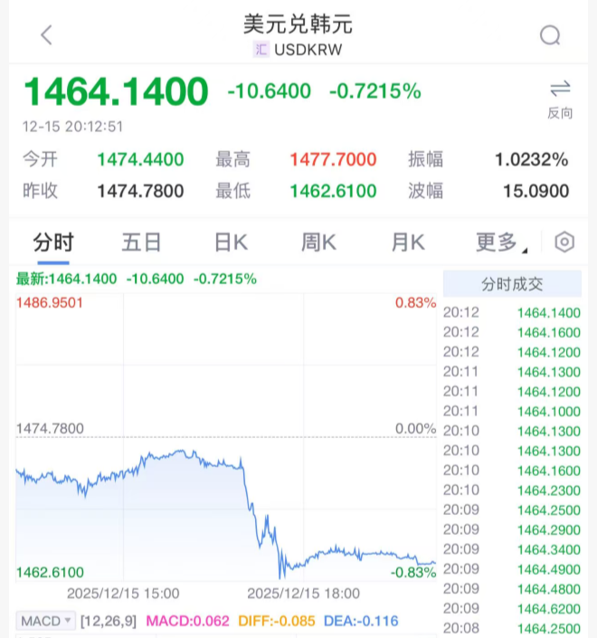 消息公布后,韩元走强,对美元汇率一度上涨0.9%。