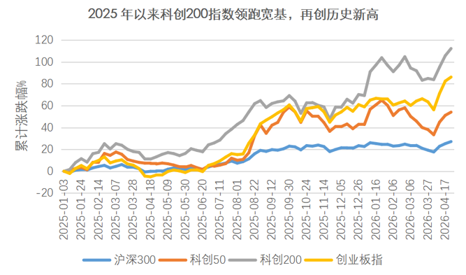 2025年以来,A股市场始终围绕科技主线展开,即便中途出现轮动震荡,以AI算力、光模块、半导体为核心的硬科技依旧是全场最亮眼的主角。自2025年开启的这轮科技结构性牛市里,一支宽基“新秀”悄悄跑出了惊艳全场的成绩——哪怕科技板块受地缘扰动多次震荡调整,它却默默刷新历史新高,它就是聚焦科技新锐的科创200指数(000699.SH)。截至2026年4月22日收盘,该指数再创历史新高,2025年以来累计涨幅达93%,大幅领先科创50的42%与创业板指的70%,堪称科技行情里名副其实的风向标与领涨标杆。(数据来源:Wind,时间截至2026/4/21,指数过往表现不预示未来,不构成对基金业绩的保证)