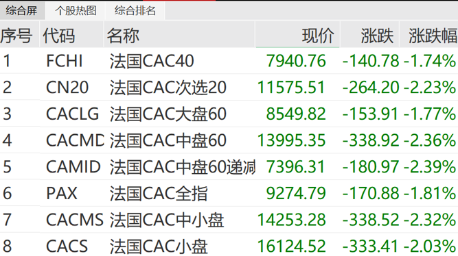 主要成份股中,银行股领跌,法国兴业银行、法国巴黎银行、法国农业信贷银行跌幅居于前列。