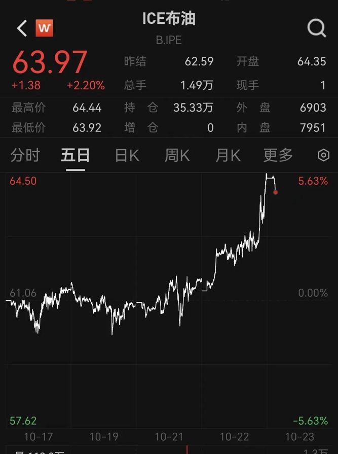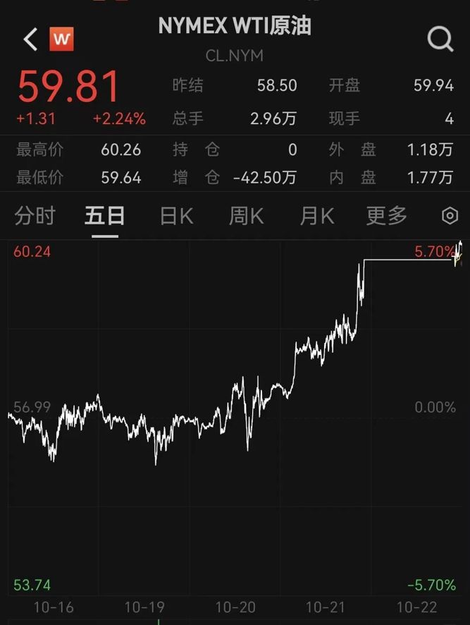 10月22日深夜,国际油价突然大涨,WTI原油期货和布伦特原油期货均涨超4%。截至收盘,WTI原油期货上涨3.74%,布伦特原油期货上涨4.94%。
